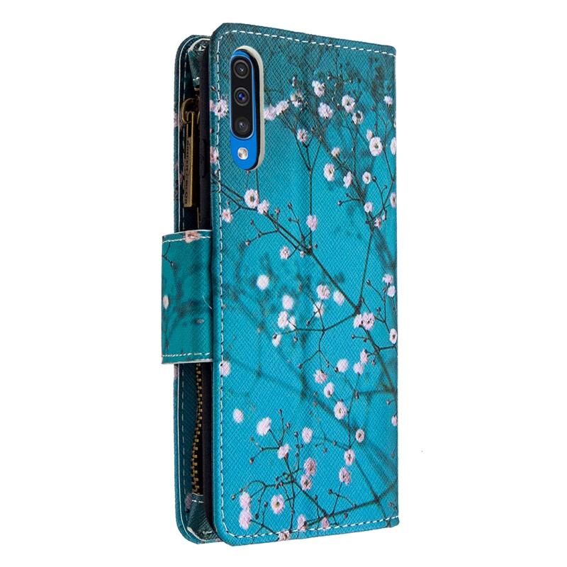 Θήκη Samsung Galaxy A50 Δερμάτινη Οριζόντια με Φερμουάρ, Πολύχρωμο Σχέδιο, με Θήκη & Θήκες Καρτών & Πορτοφόλι (Λουλούδι Δαμασκηνιάς)