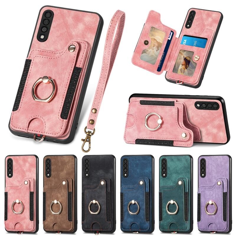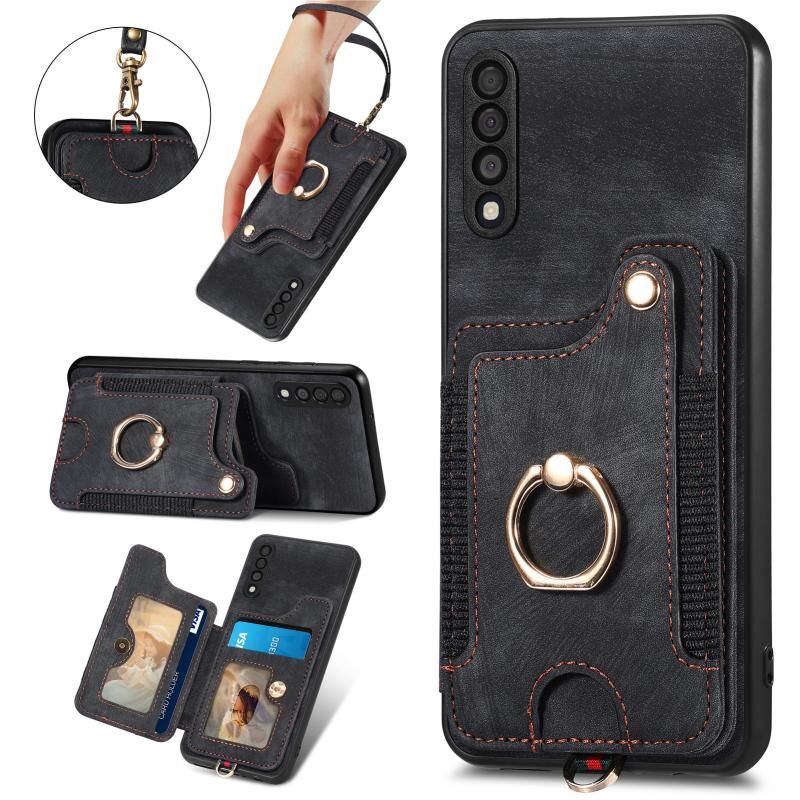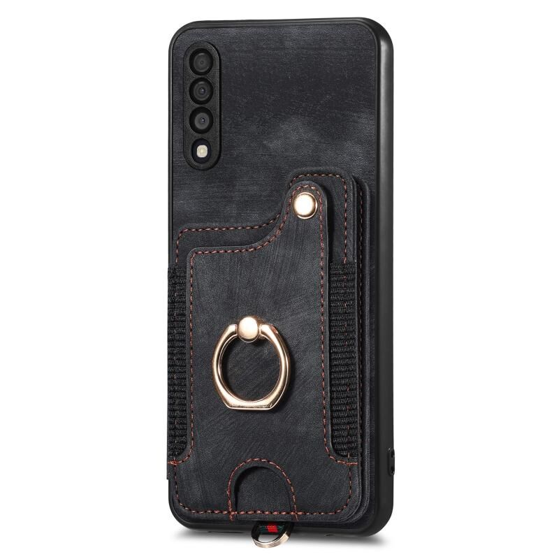 Για Samsung Galaxy A50 Ρετρό δέρμα αίσθηση δαχτυλίδι πολυ-κάρτα πορτοφόλι υπόθεση τηλεφώνου (μαύρο)