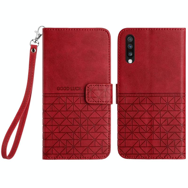 For Samsung Galaxy A50 Rhombic Texture Leather Phone Case with Lanyard(Red)