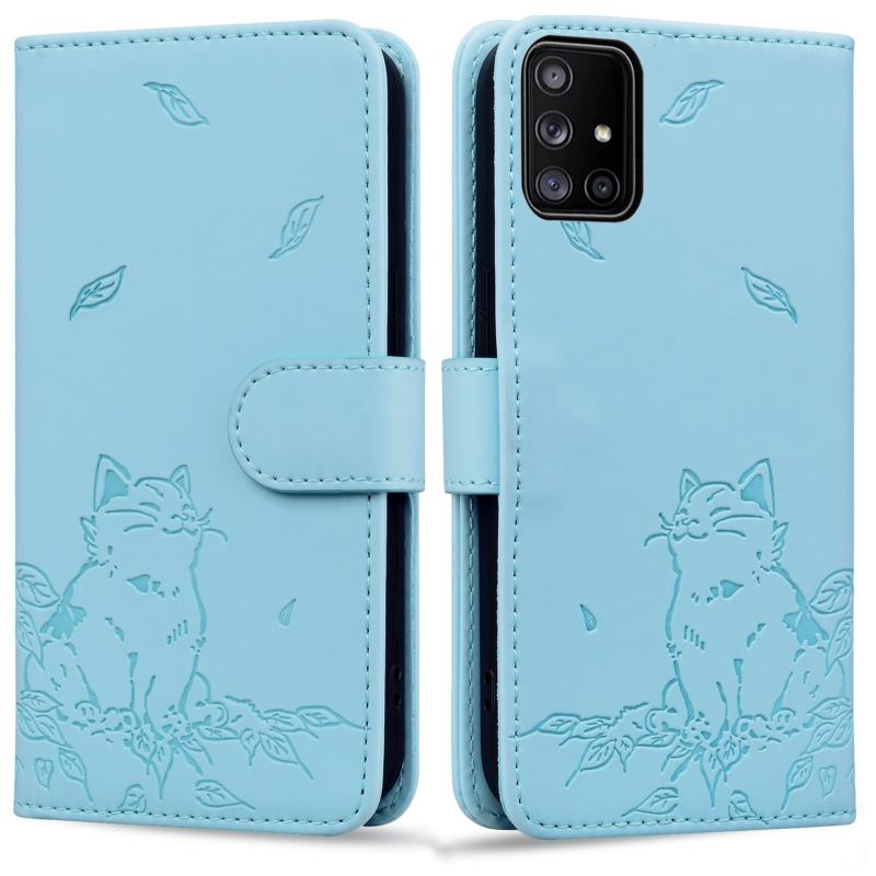 For Samsung Galaxy A51 4G Cute Cat Embossed Leather Phone Case(Sky Blue)