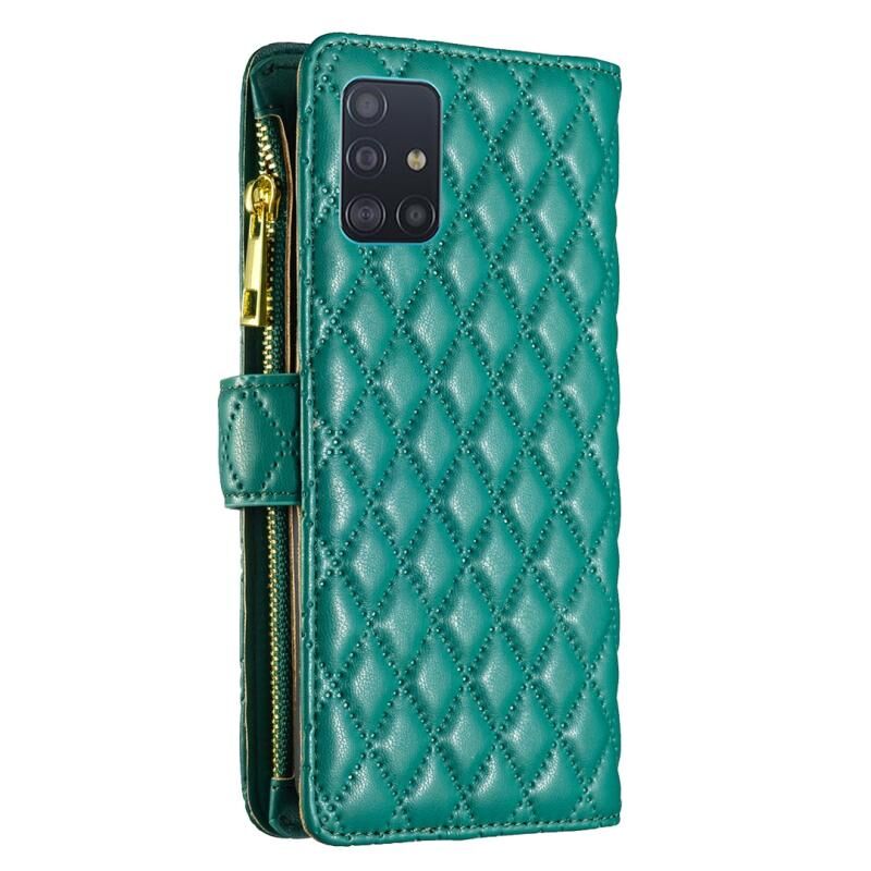Θήκη τηλεφώνου Samsung Galaxy A51 4G, Δερμάτινη θήκη τύπου πορτοφολιού με φερμουάρ και σχέδιο διαμαντένιου πλέγματος (Λευκό)