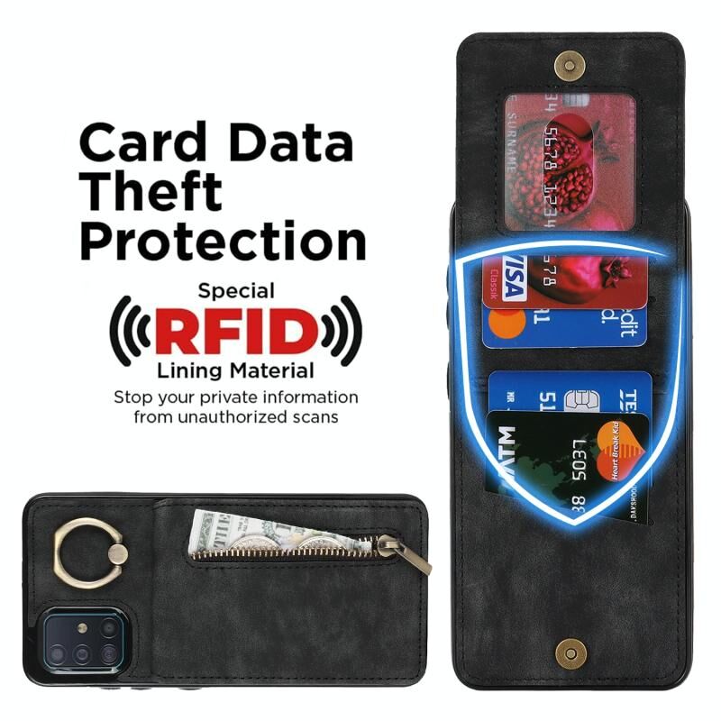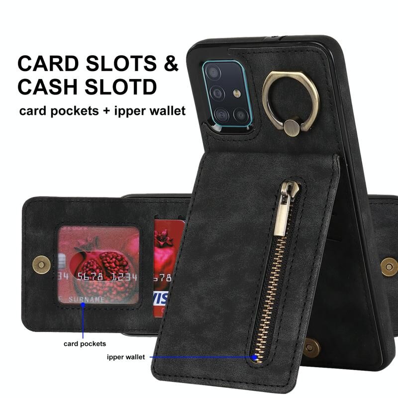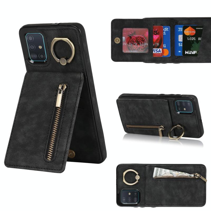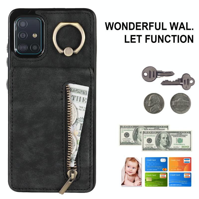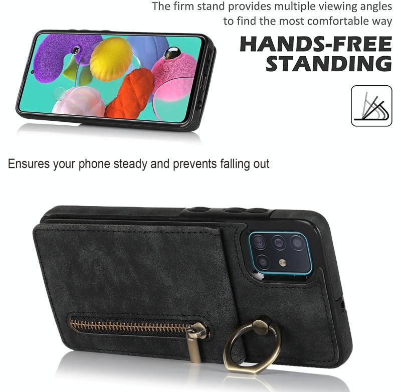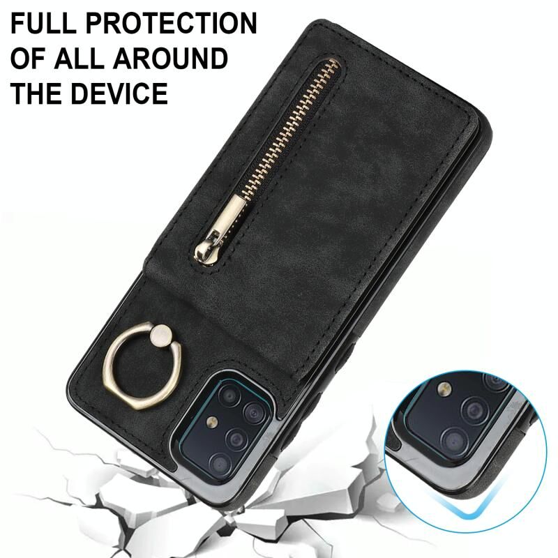 Θήκη κινητού τηλεφώνου Samsung Galaxy A51 4G με ρετρό δακτύλιο και φερμουάρ, θήκη καρτών RFID (Μαύρο)