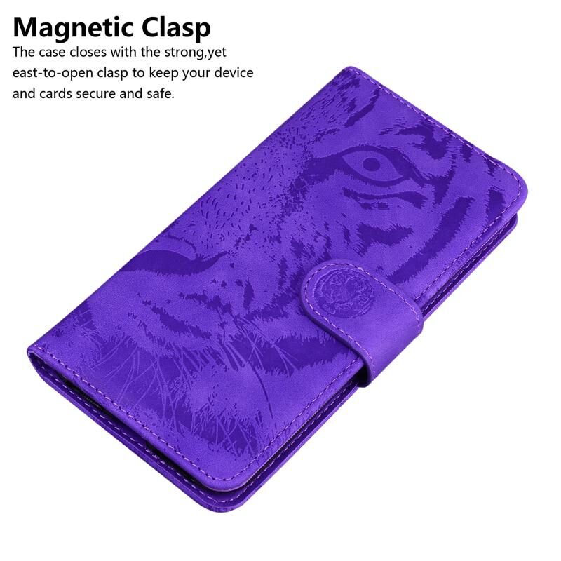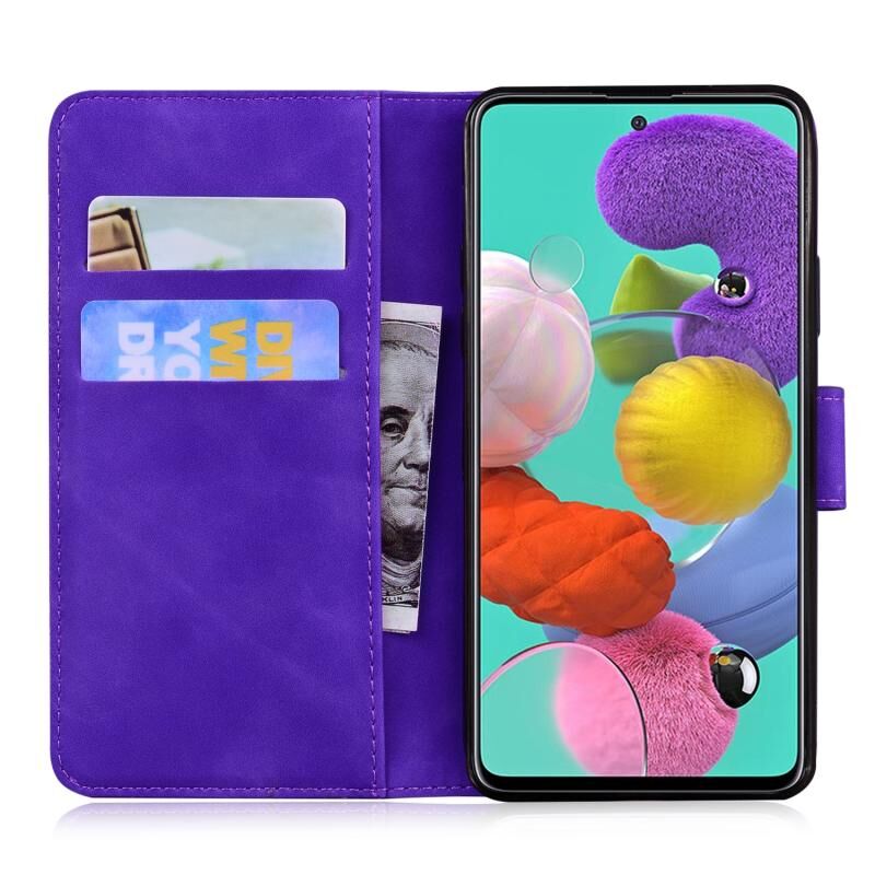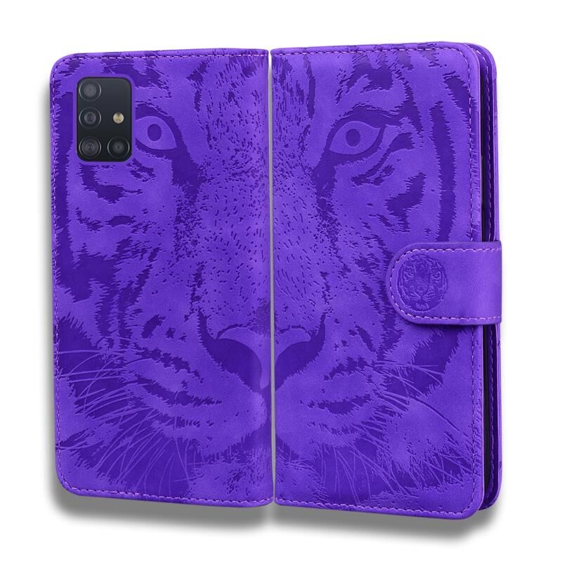 Θήκη Samsung Galaxy A51 4G από δέρμα με οριζόντιο άνοιγμα, ανάγλυφο σχέδιο τίγρης, με βάση & θήκες καρτών & πορτοφόλι (Μωβ)