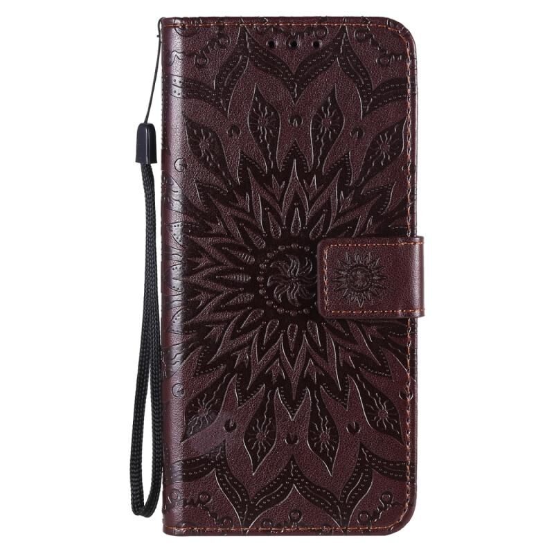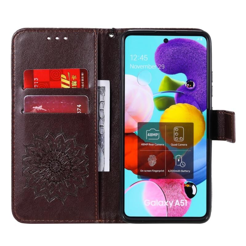 Για Samsung Galaxy A51 5G ανάγλυφο ηλιοτρόπιο μοτίβο οριζόντια Flip PU δέρμα υπόθεση με θήκη & υποδοχές για κάρτες & πορτοφόλι & κορδόνι (καφέ)