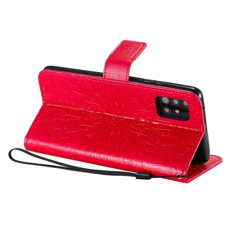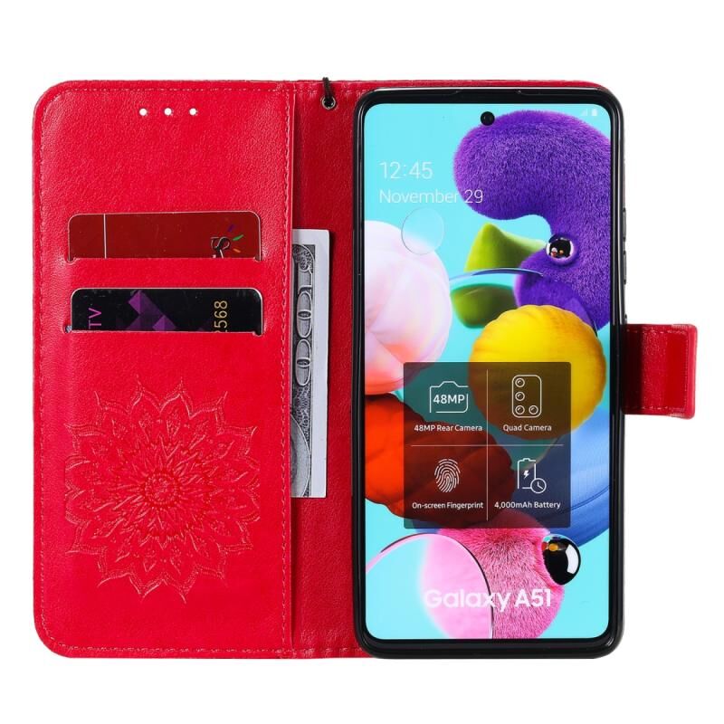 Για Samsung Galaxy A51 5G ανάγλυφο ηλιοτρόπιο μοτίβο οριζόντια Flip PU δέρμα υπόθεση με θήκη & υποδοχές για κάρτες & πορτοφόλι & κορδόνι (κόκκινο)