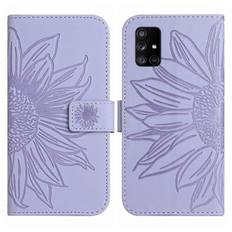 Για το Samsung Galaxy A51 5G δέρμα αίσθηση Sun Flower μοτίβο Flip δέρμα τηλέφωνο υπόθεση με κορδόνι (μωβ)