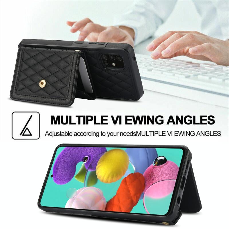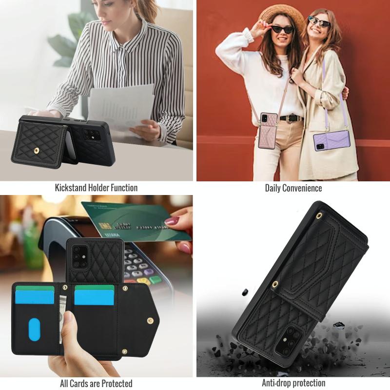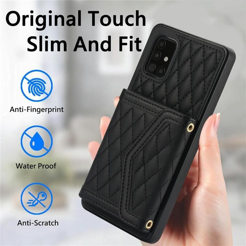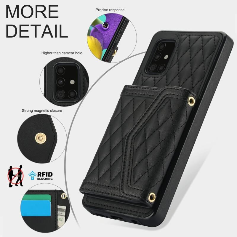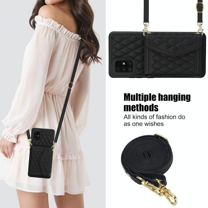 For Samsung Galaxy A51 5G Splicing Rhombic Texture Card Bag Phone Case with Long Lanyard(Black)