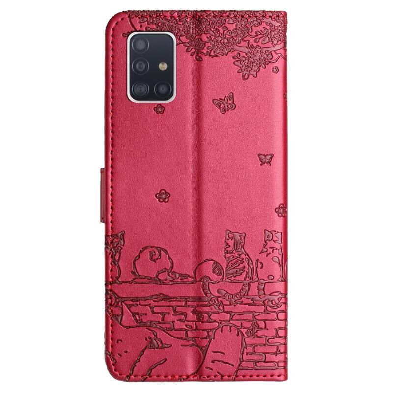 Θήκη τηλεφώνου Samsung Galaxy A51 με δέρμα και ανάγλυφο σχέδιο γατιού με κορδόνι (Κόκκινο)