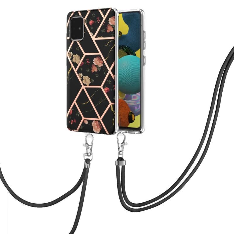 Θήκη για Samsung Galaxy A51 με ηλεκτρολυτική επιμετάλλωση, συνδυασμό μαρμάρου και λουλουδιών, από TPU με προστασία από κραδασμούς και λουρί (Ροζ Λουλούδι)