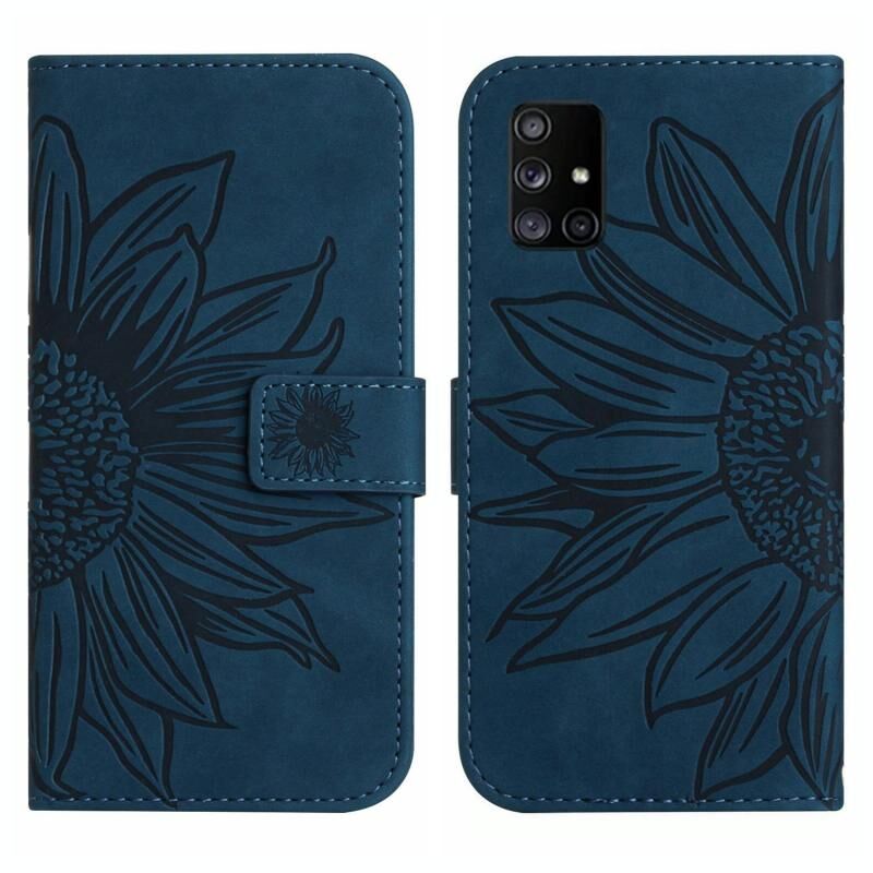 Για το Samsung Galaxy A51/M40S δέρμα αίσθηση Sun Flower μοτίβο Flip δέρμα τηλέφωνο υπόθεση με κορδόνι (Inky Blue)