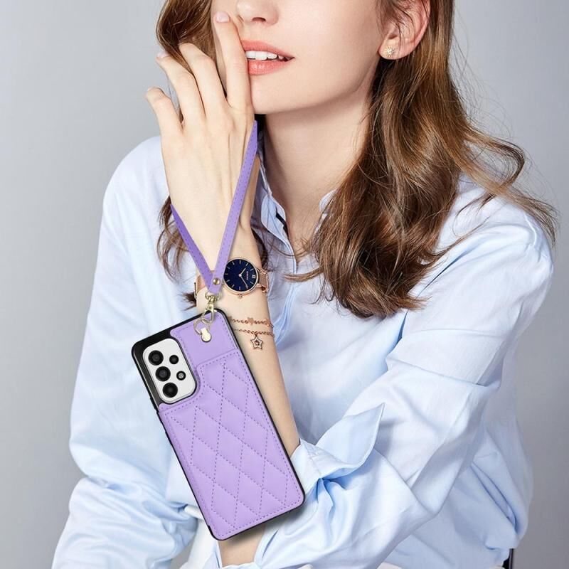 Για το Samsung Galaxy A52 4G / 5G / A52s 5G Rhombic διπλή πόρπη υποδοχές κάρτας υπόθεση τηλεφώνου με κορδόνι (μωβ)