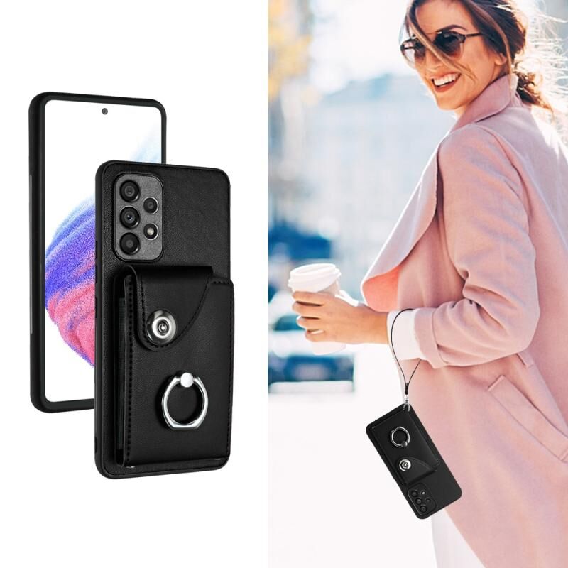 Για Samsung Galaxy A52 4G/5G Οργανική κάρτα τσάντα δαχτυλίδι κάτοχος PU υπόθεση τηλεφώνου με κορδόνι (Μαύρο)