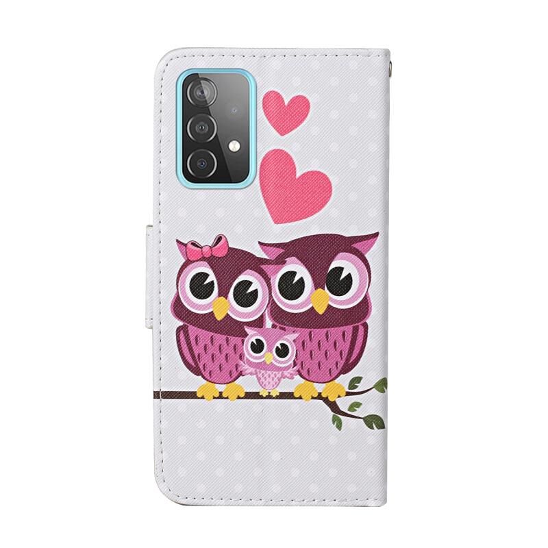 Θήκη δέρματος οριζόντιας αναδίπλωσης με σχέδια πολύχρωμης ζωγραφικής για Samsung Galaxy A52 5G / 4G με βάση στήριξης & υποδοχές καρτών & πορτοφόλι & κορδόνι (Οικογένεια Κουκουβάγιας)