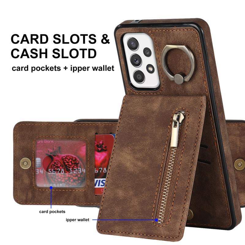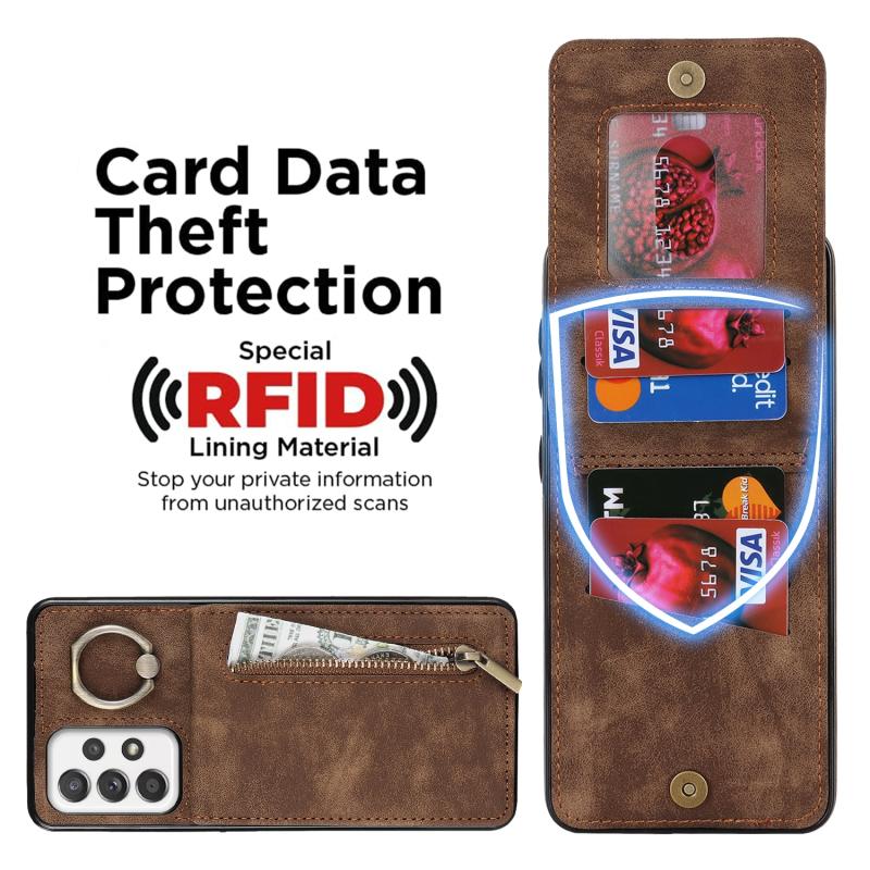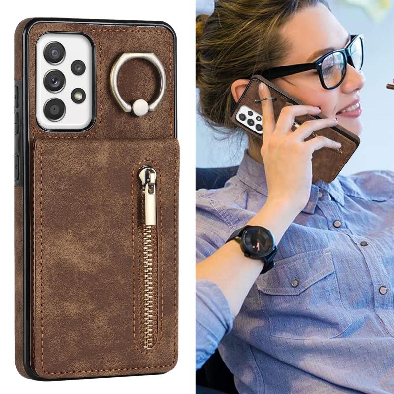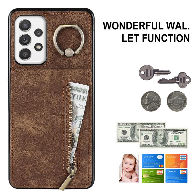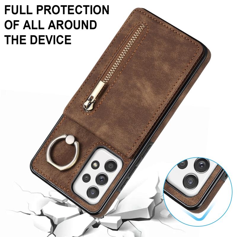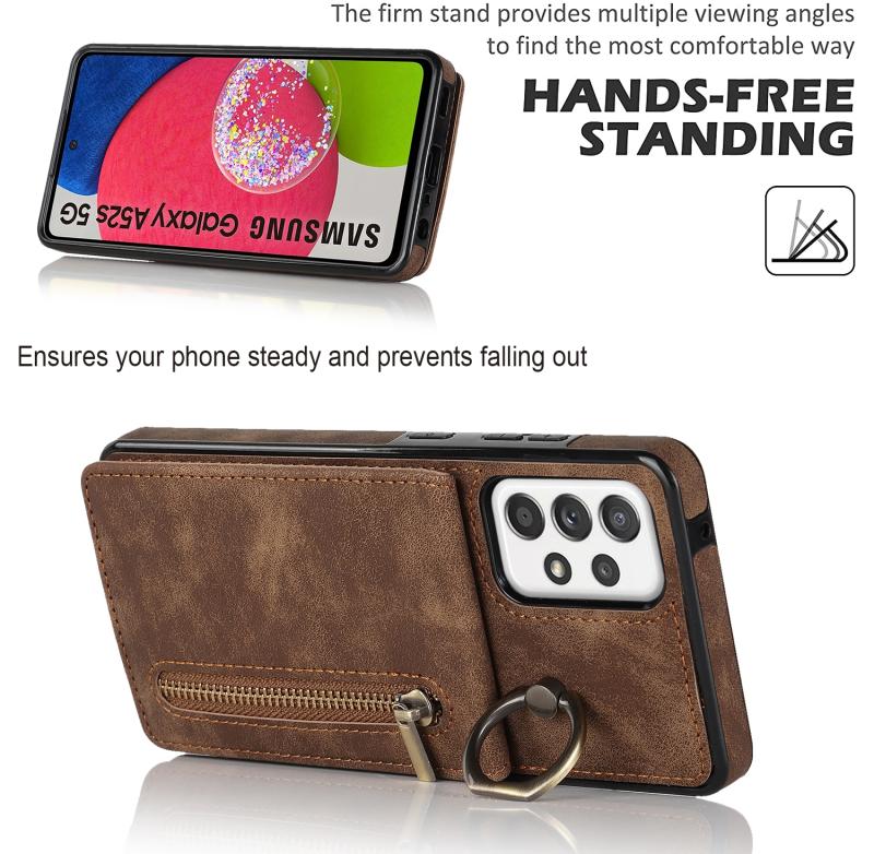 Θήκη κινητού τηλεφώνου Samsung Galaxy A52 5G Retro με δακτύλιο και φερμουάρ, θήκη καρτών RFID (Καφέ)