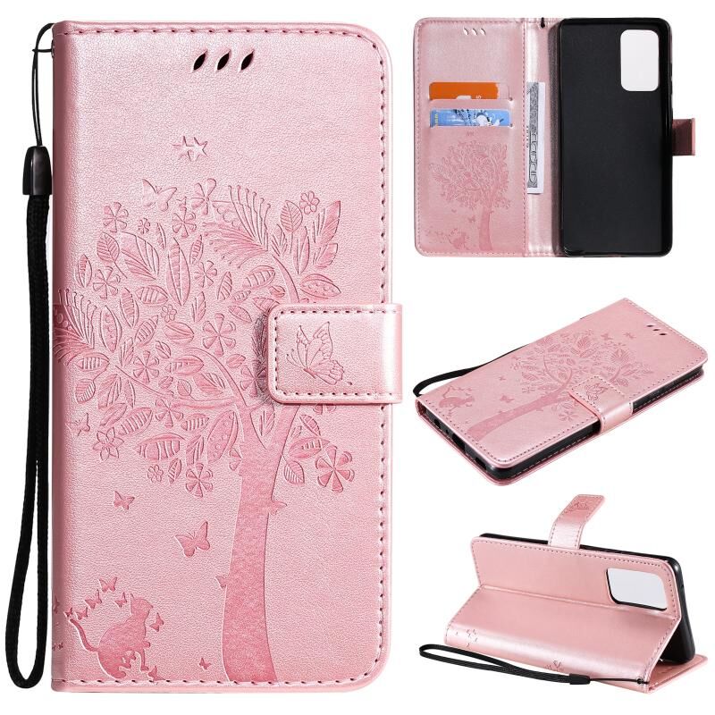 Για Samsung Galaxy A52 5G Δέντρο & Cat μοτίβο πιεσμένη εκτύπωση οριζόντια Flip PU δέρμα υπόθεση με θήκη & υποδοχές για κάρτες & πορτοφόλι & Lanyard (Rose χρυσό)