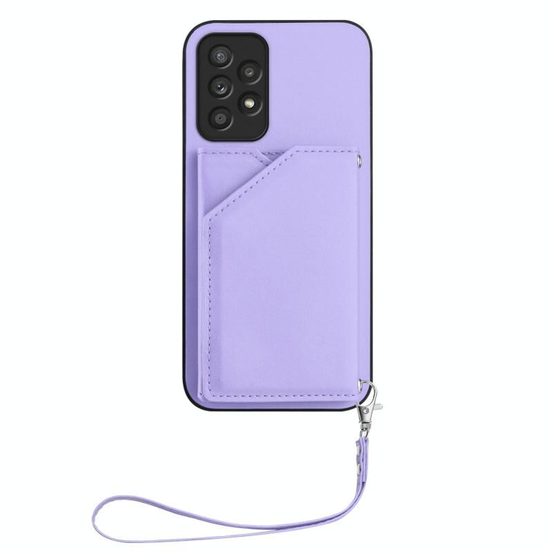 Για Samsung Galaxy A52 δέρμα αίσθηση τέσσερις υποδοχές κάρτα τηλέφωνο υπόθεση με λουράκι καρπού (μωβ)