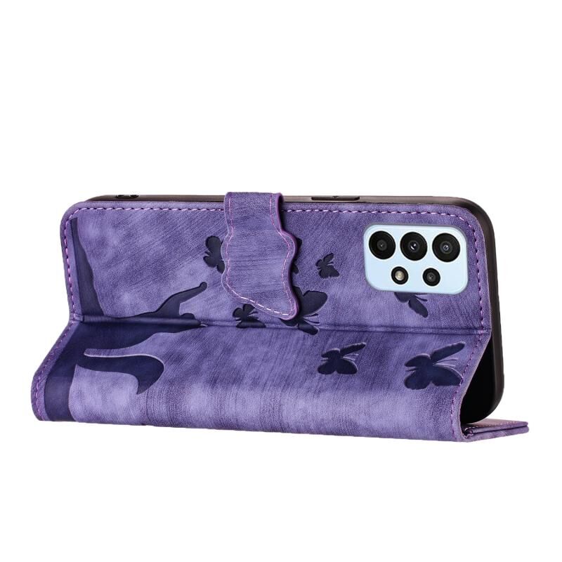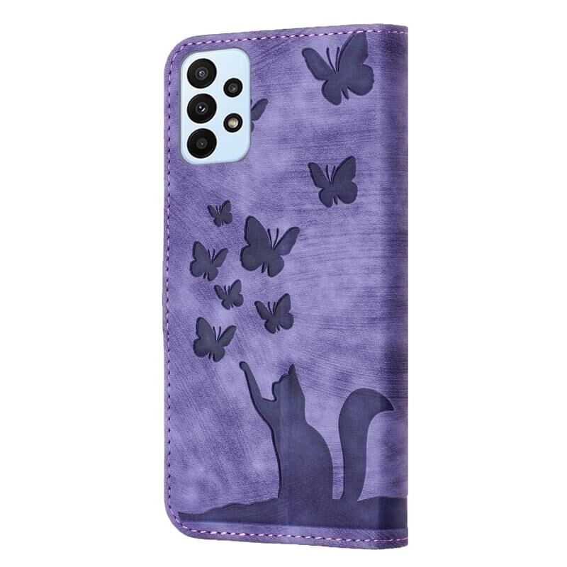 Θήκη τηλεφώνου Samsung Galaxy A53 5G, δερμάτινη, τύπου flip, με ανάγλυφο σχέδιο πεταλούδας και γάτας (Μωβ)