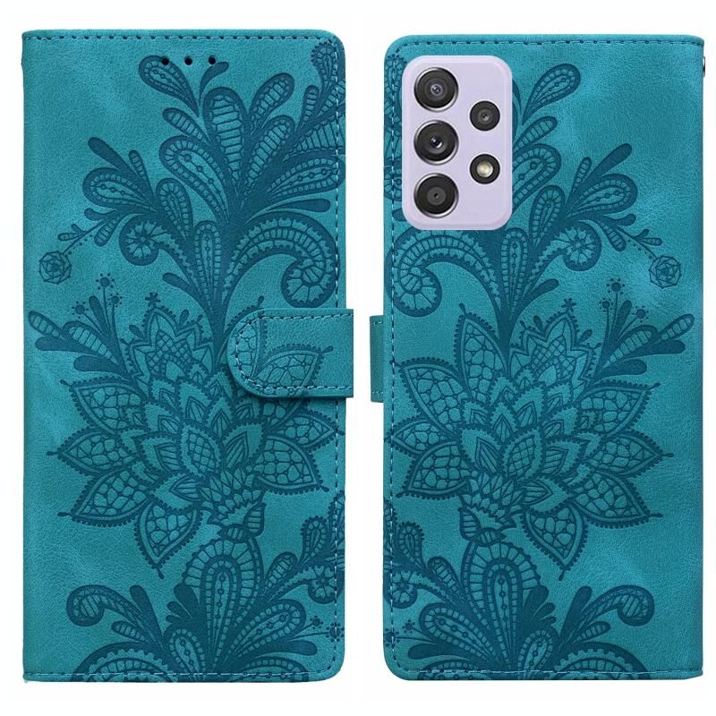 Θήκη κινητού τηλεφώνου Samsung Galaxy A53 5G από PU με δαντελένιο λουλουδάτο ανάγλυφο και μαγνητικό κούμπωμα, με λουρί καρπού (Πράσινο)