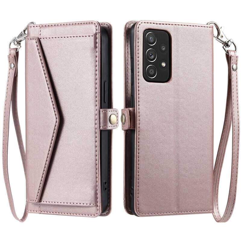 Θήκη τηλεφώνου Samsung Galaxy A53 5G, δερμάτινη, με πολλαπλές θήκες για κάρτες και λουρί (Ροζ χρυσός)