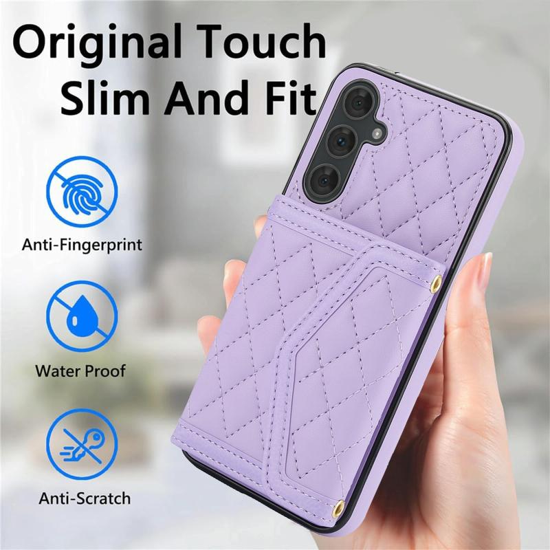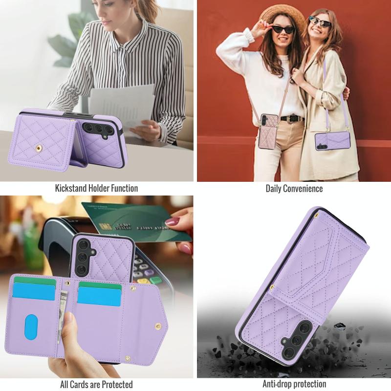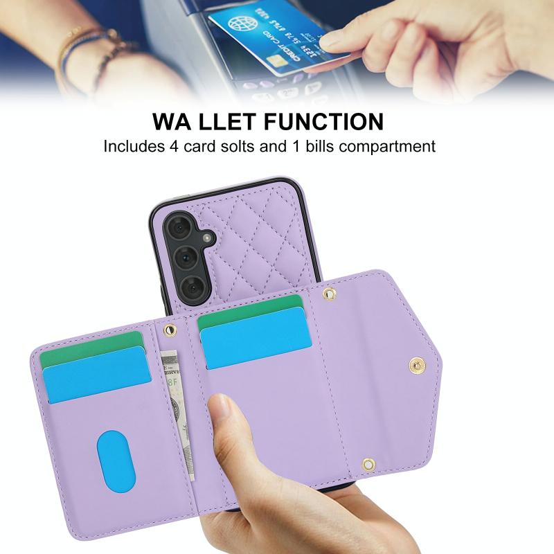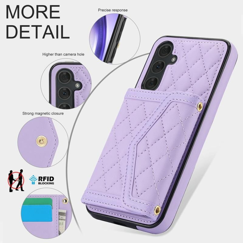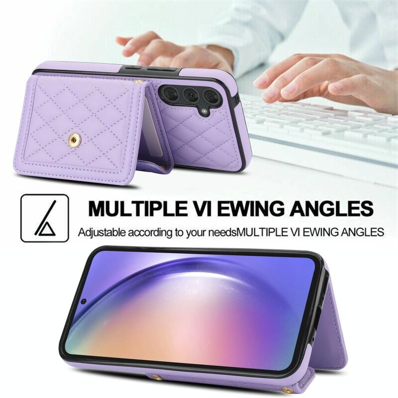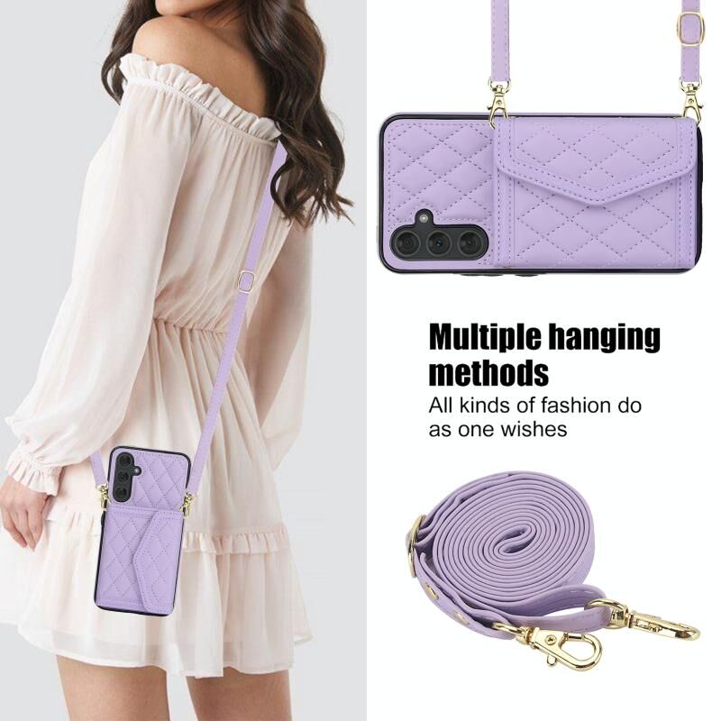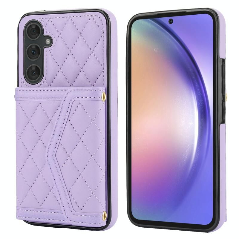 For Samsung Galaxy A54 4G / 5G Splicing Rhombic Texture Card Bag Phone Case with Long Lanyard(Purple)