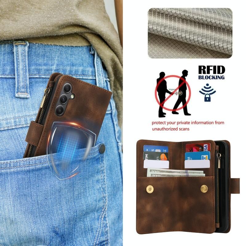 Για Samsung Galaxy A54 5G Dream 9-Card φερμουάρ πορτοφόλι RFID δερμάτινη θήκη τηλεφώνου με κορδόνι (καφέ)