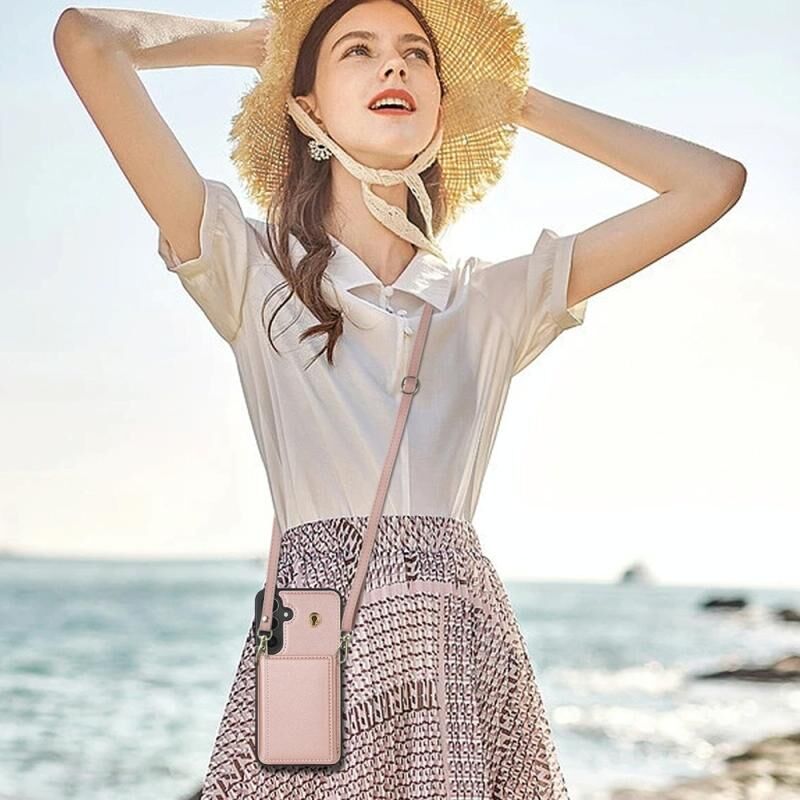 Για Samsung Galaxy A54 5G Τρεις φορές κάρτα τσάντα υπόθεση τηλεφώνου με μακρύ κορδόνι (ροζ χρυσό)