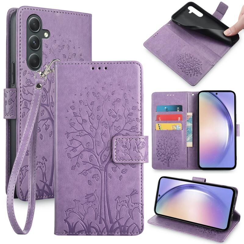 Για Samsung Galaxy A54 5G δέντρο & ελάφι ανάγλυφη δερμάτινη θήκη τηλεφώνου (μωβ)