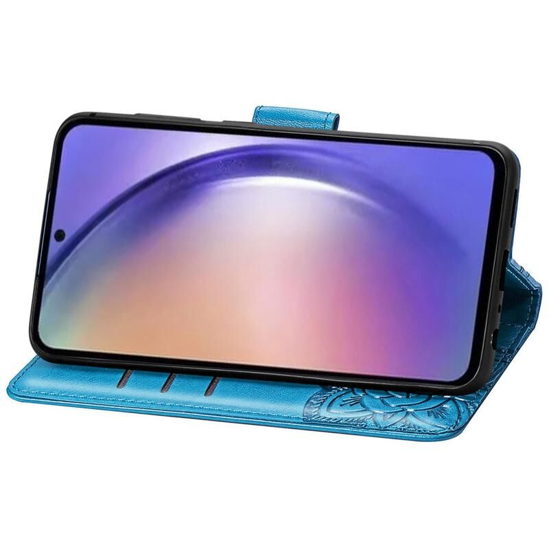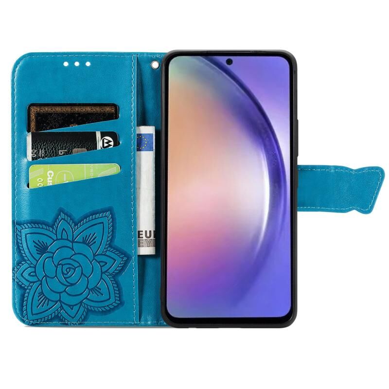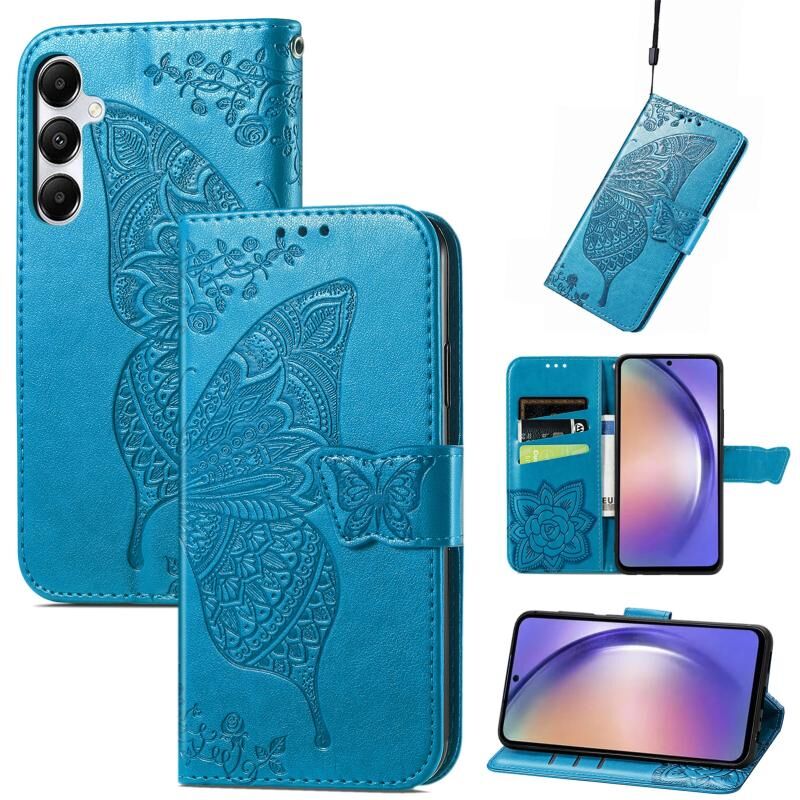 Για Samsung Galaxy A55 5G πεταλούδα αγάπη λουλούδι ανάγλυφο δερμάτινη θήκη τηλεφώνου (μπλε)