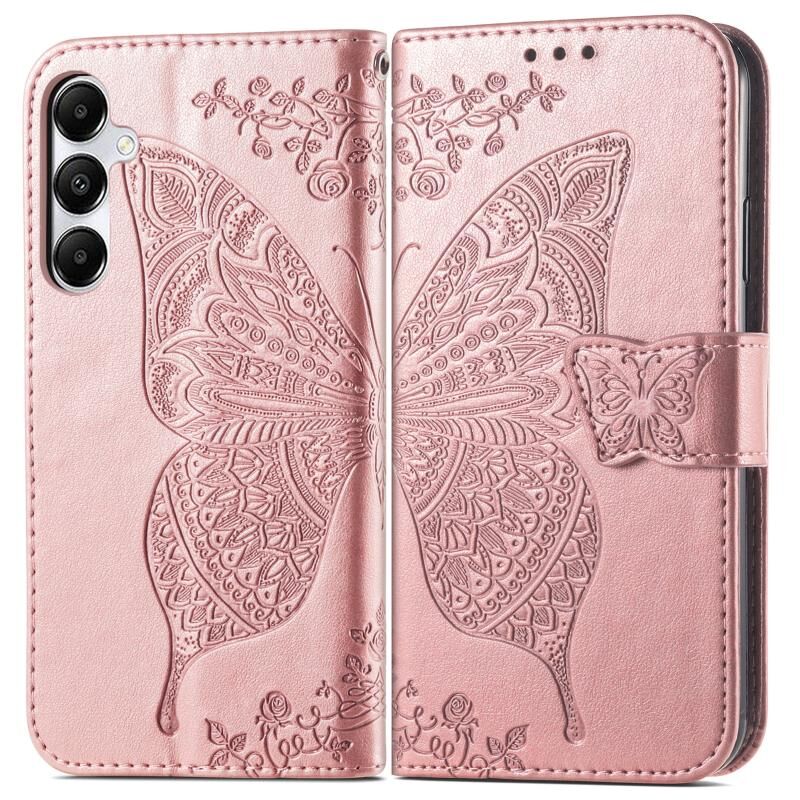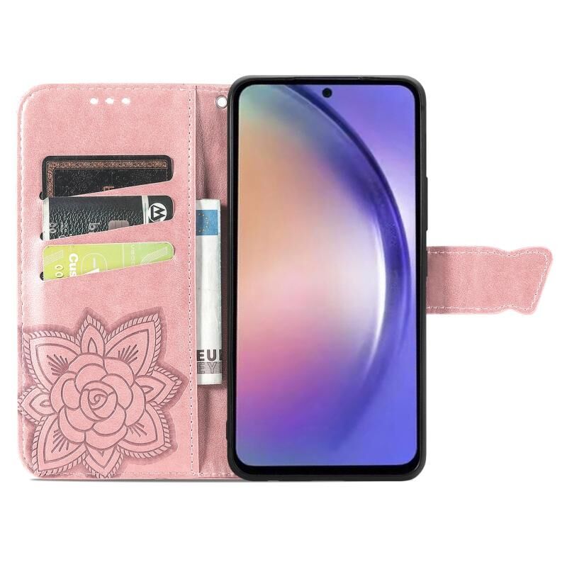 Για Samsung Galaxy A55 5G πεταλούδα αγάπη λουλούδι ανάγλυφο δερμάτινη θήκη τηλεφώνου (Rose Gold)