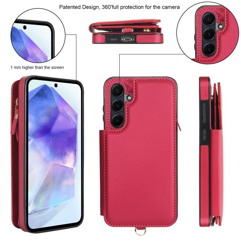 Θήκη τηλεφώνου Samsung Galaxy A55 5G από δέρμα με διπλό κλείσιμο με φερμουάρ και RFID, με κοντό κορδόνι (Κόκκινο)
