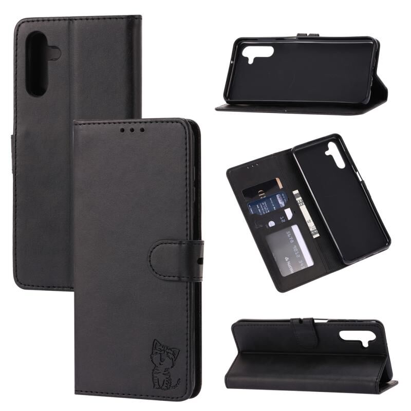 Για Samsung Galaxy A55 5G Παγκόσμια ανάγλυφο Happy Cat μοτίβο Flip δέρμα τηλέφωνο υπόθεση (Μαύρο)