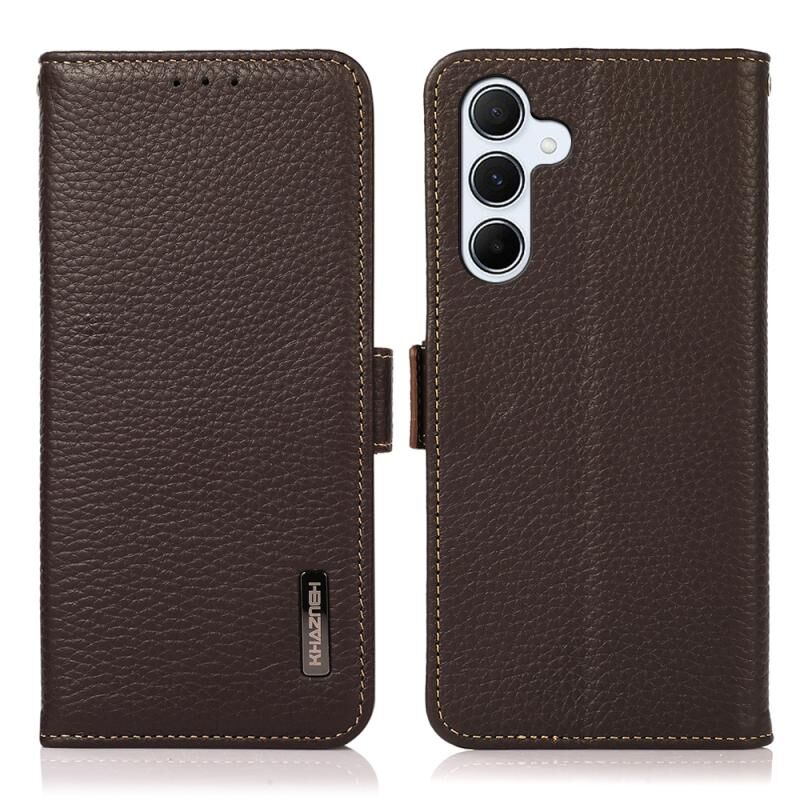Θήκη κινητού τηλεφώνου Samsung Galaxy A55 5G KHAZNEH με μαγνητικό κλείσιμο, από γνήσιο δέρμα Litchi και προστασία RFID (Καφέ)