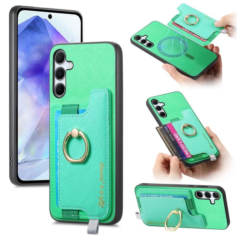 Θήκη κινητού Samsung Galaxy A55 5G Retro Cross από δέρμα με δακτύλιο, οριζόντια θήκη κάρτας, συμβατή με MagSafe (Ροζ)