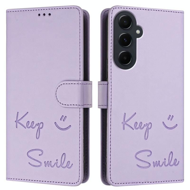 Για Samsung Galaxy A55 5G Χαμόγελο ανάγλυφο RFID δερμάτινη θήκη τηλεφώνου (Light Purple)