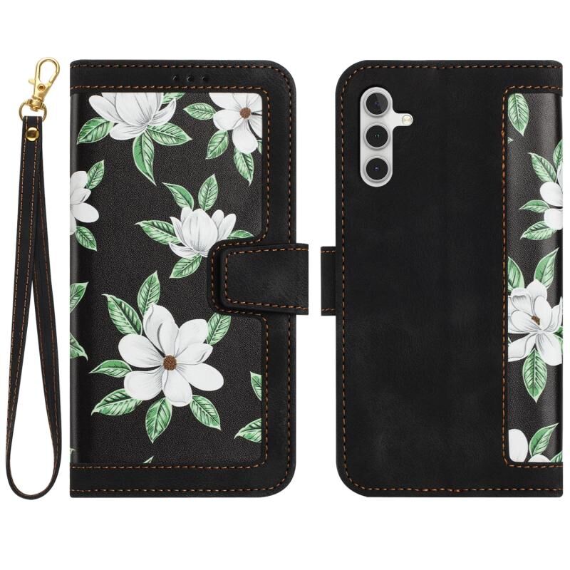 Θήκη τηλεφώνου Samsung Galaxy A55 από δέρμα με λουλουδάτο σχέδιο και κορδόνι (Μαύρο)
