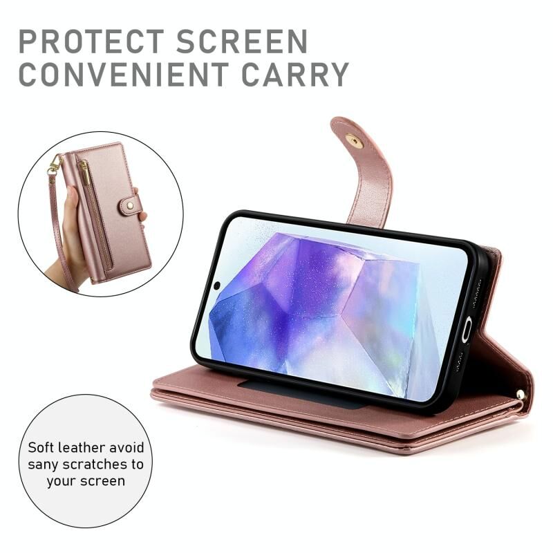 Για Samsung Galaxy A55 Nine Card-slot φερμουάρ πορτοφόλι τσάντα δερμάτινη θήκη τηλεφώνου (ρόζ)