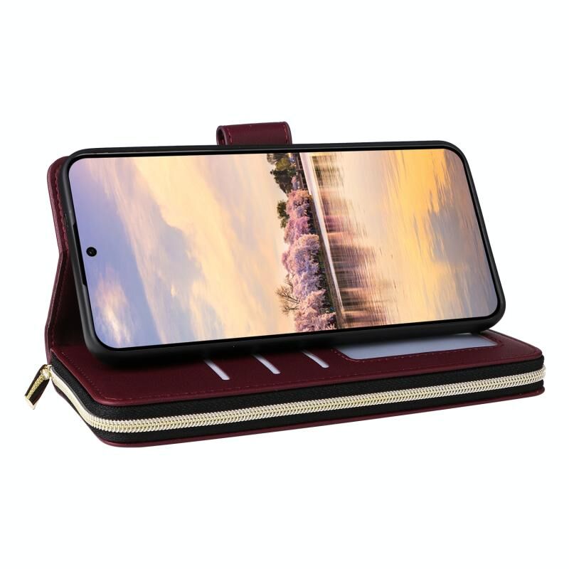 Για Samsung Galaxy A55 Εννέα-κάρτα Slots φερμουάρ πορτοφόλι τσάντα δερμάτινη θήκη τηλεφώνου (Κρασοκόκκινο)