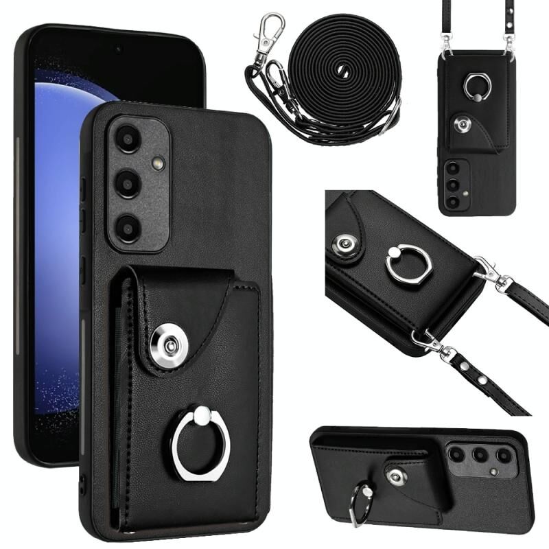 Για Samsung Galaxy A55 Οργανική κάρτα τσάντα τσάντα δαχτυλίδι κάτοχος θήκη τηλεφώνου με μακρύ κορδόνι (Μαύρο)