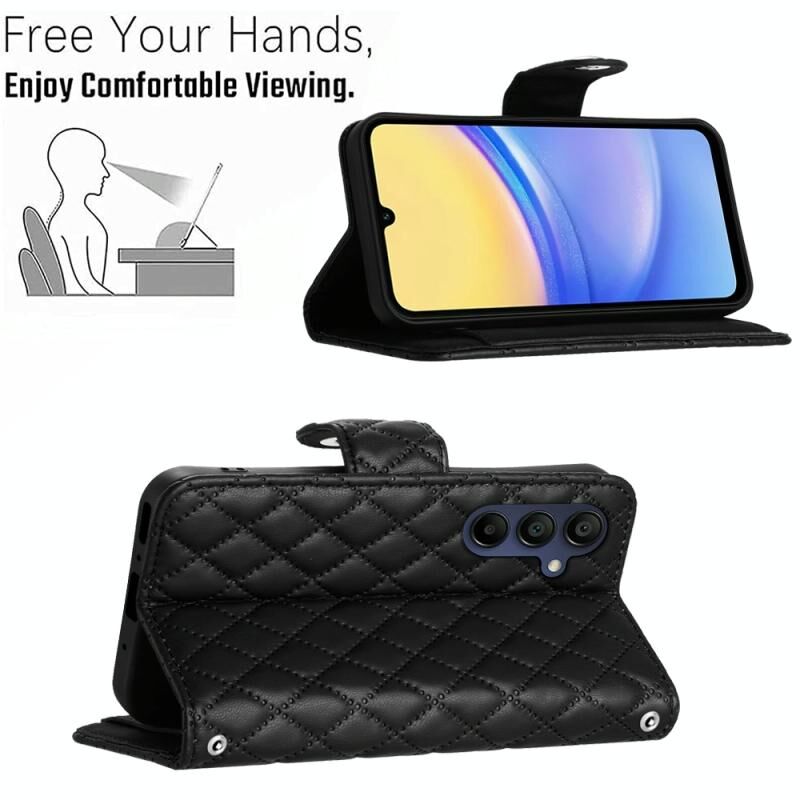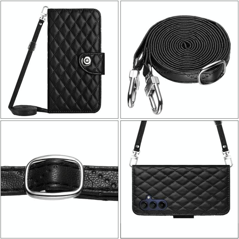 Για Samsung Galaxy A55 Rhombic υφή Flip δερμάτινη θήκη τηλεφώνου με μακρύ κορδόνι (μαύρο)