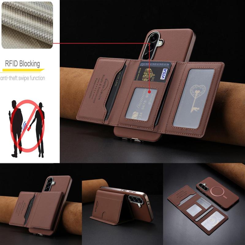 For Samsung Galaxy A55 Solid Color Horizontal Magnetic Card Bag RFID MagSafe Phone Case(Brown)