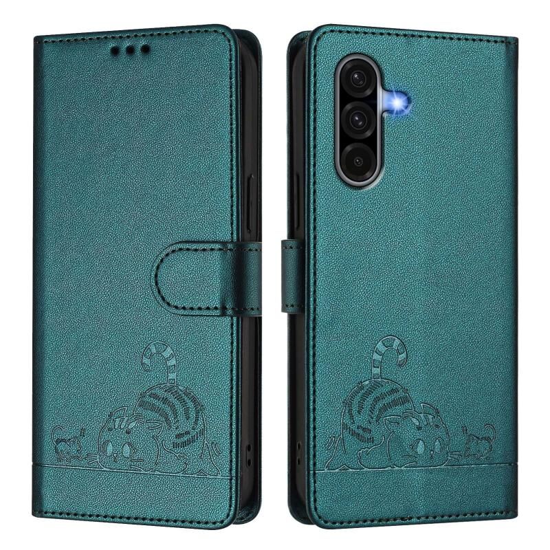 Θήκη τηλεφώνου Samsung Galaxy A56 5G από δέρμα με ανάγλυφο σχέδιο γάτας και ποντικιού, με κορδόνι (Μέντας Πράσινο)