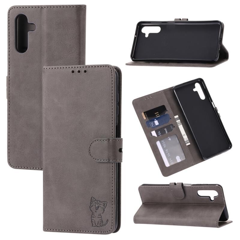 Θήκη τηλεφώνου Samsung Galaxy A56 5G, δερμάτινη, με ανάγλυφο σχέδιο χαρούμενης γάτας (Κόκκινη)