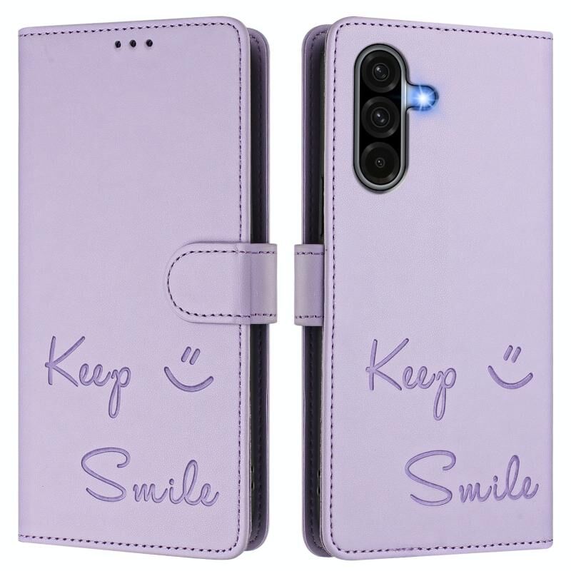 Για Samsung Galaxy A56 5G Χαμόγελο ανάγλυφο RFID δερμάτινη θήκη τηλεφώνου (Light Purple)