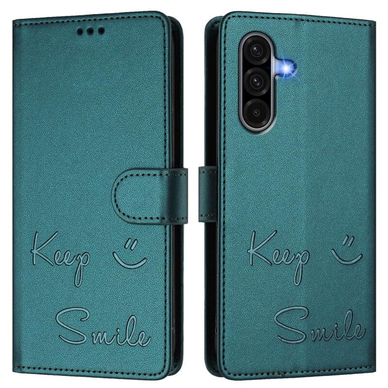 Για Samsung Galaxy A56 5G Χαμόγελο ανάγλυφο RFID δερμάτινη θήκη τηλεφώνου (Πράσινο παγώνι)