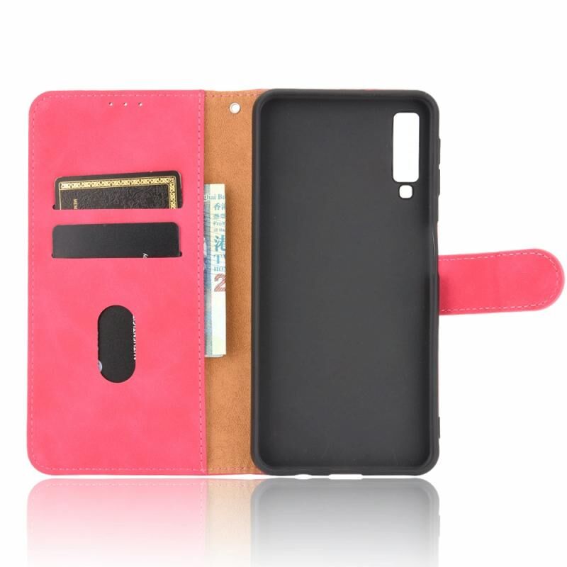 Θήκη για Samsung Galaxy A7 (2018) με μαγνητικό κούμπωμα, οριζόντια, με υφή δέρματος μοσχαριού, από PU δέρμα σε μονόχρωμο χρώμα, με βάση & θήκες για κάρτες & πορτοφόλι (Κόκκινο)