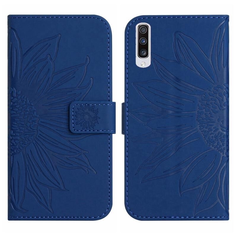 Για το Samsung Galaxy A70/A70S δέρμα αίσθηση Sun Flower μοτίβο Flip δέρμα τηλέφωνο υπόθεση με κορδόνι (σκούρο μπλε)