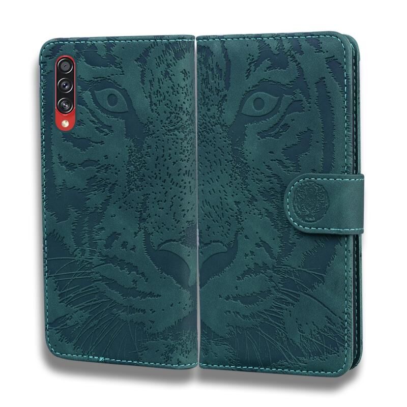 Θήκη δέρματος οριζόντιας αναδίπλωσης με ανάγλυφο μοτίβο τίγρης για Samsung Galaxy A70 / A70s με βάση & υποδοχές καρτών & πορτοφόλι (Καφέ)