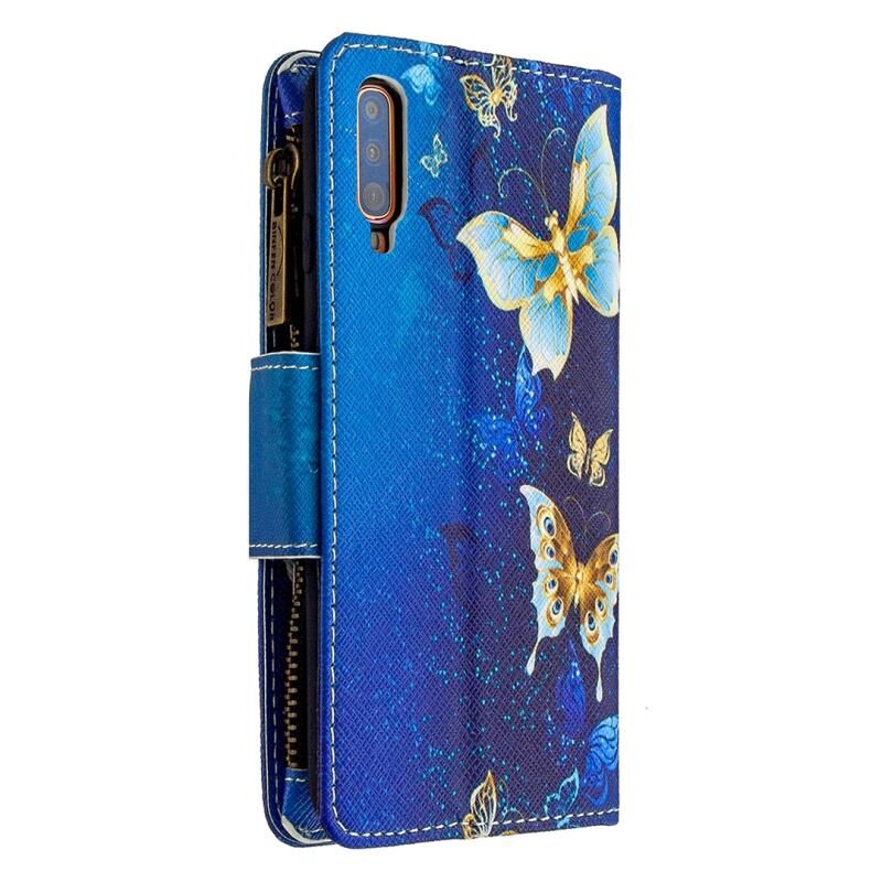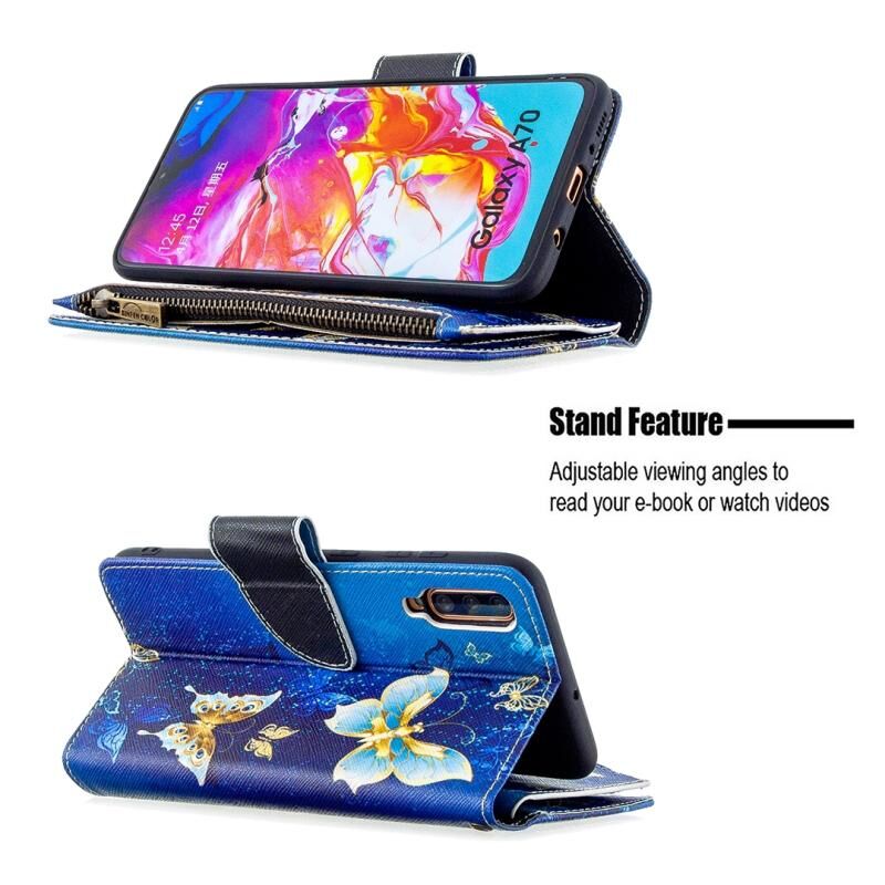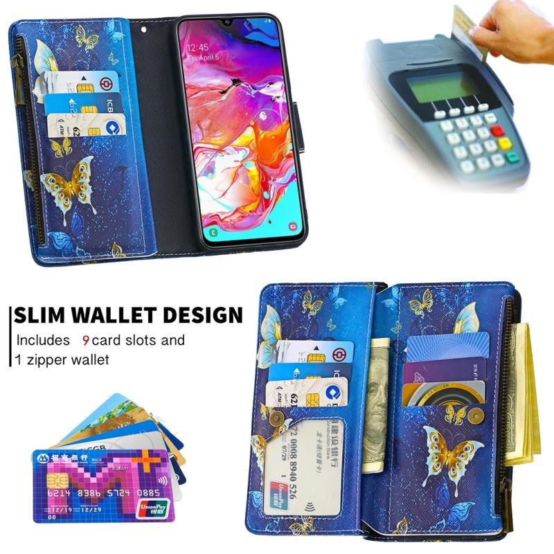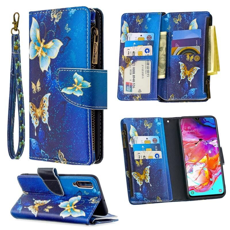 Θήκη Samsung Galaxy A70 Δερμάτινη Οριζόντια με Φερμουάρ, Πολύχρωμο Σχέδιο Ζωγραφικής, με Θήκη & Θήκες Καρτών & Πορτοφόλι (Μωβ Πεταλούδα)