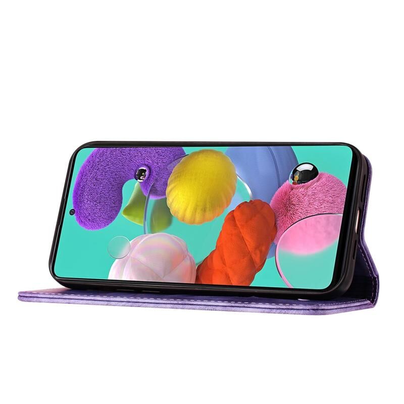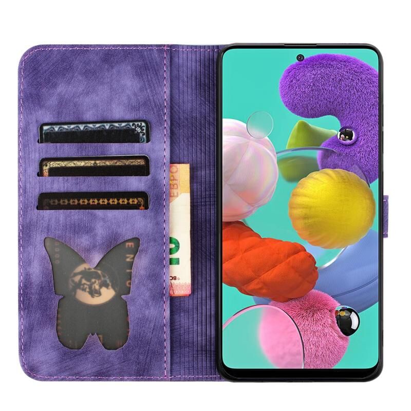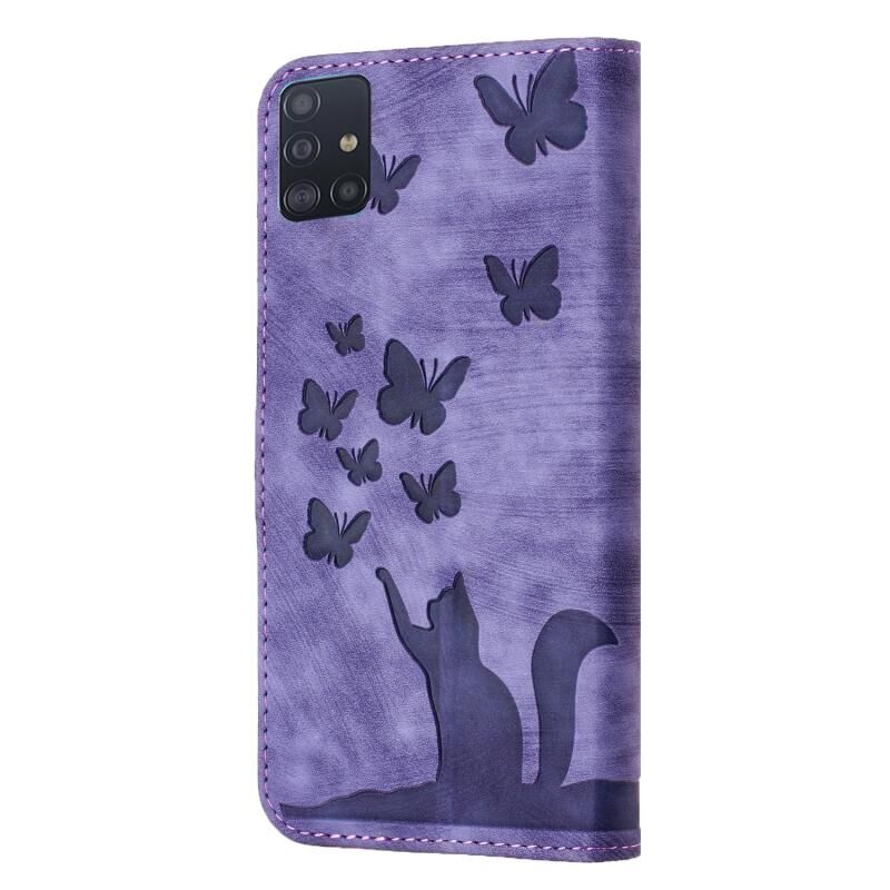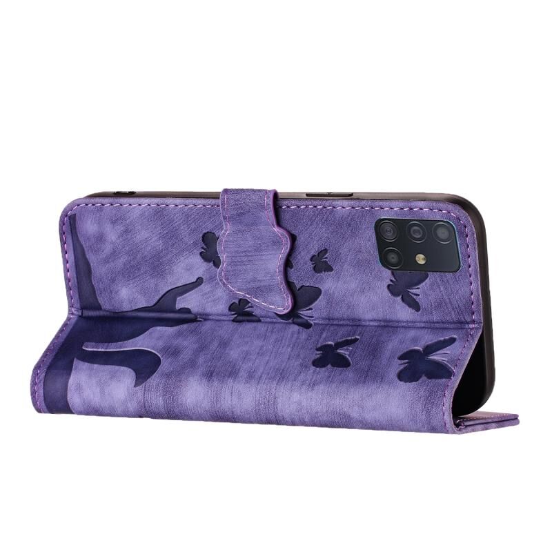 Θήκη τηλεφώνου Samsung Galaxy A71 4G με ανάγλυφο σχέδιο πεταλούδας και γάτας, δερμάτινη, τύπου flip (Μωβ)