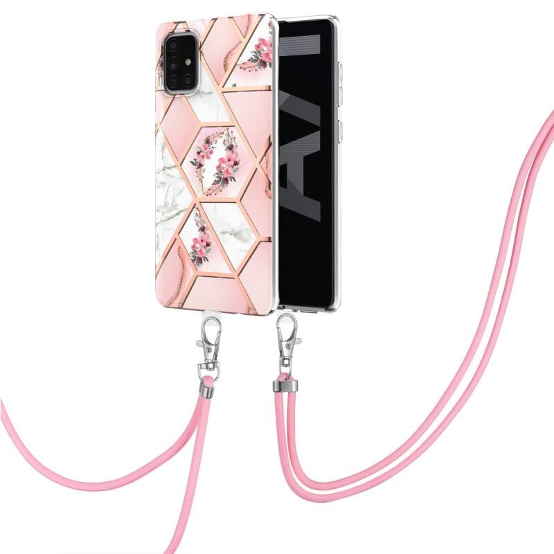 Θήκη προστασίας TPU με ηλεκτρολυτική επιμετάλλωση, συνδυασμό μαρμάρου και λουλουδιών, αντικραδασμική για Samsung Galaxy A71 5G με κορδόνι (Ροζ άνθος)